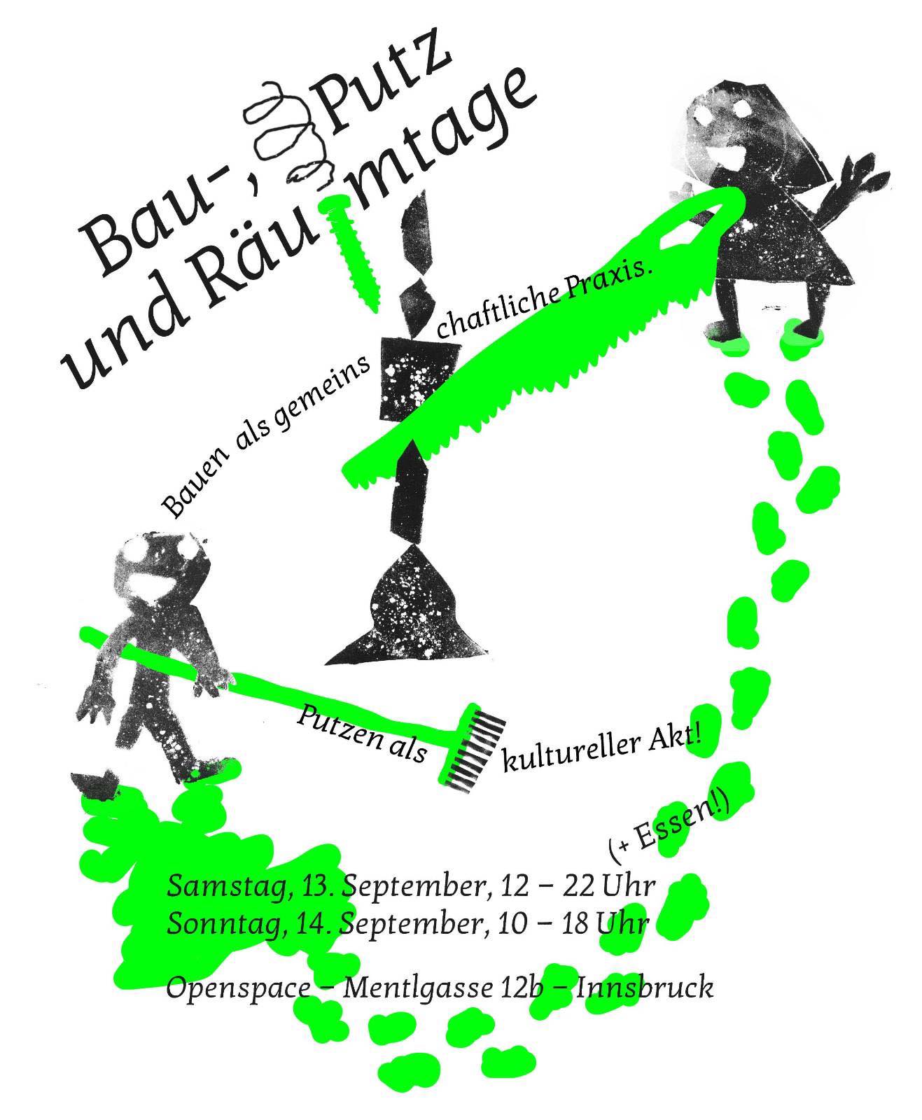 Putzen als kultureller Akt! Bauen als gemeinschaftliche Praxis. Am Wochenende des 13./14. September stellen wir die (sonst) unsichtbare Care-Arbeit ins Zentrum und laden euch ein, gemeinsam anzupacken. Ob Büro, Werkstatt, Garten – im Openspace warten viele kleine und größere Projekte auf eure Kreativität und Mitarbeit. Dazu gibts eine kleine Präsentation unserer Nachbaren und vegetarisches Dinner. Bringt euch selbst, eure Freund:innen und Kinder!