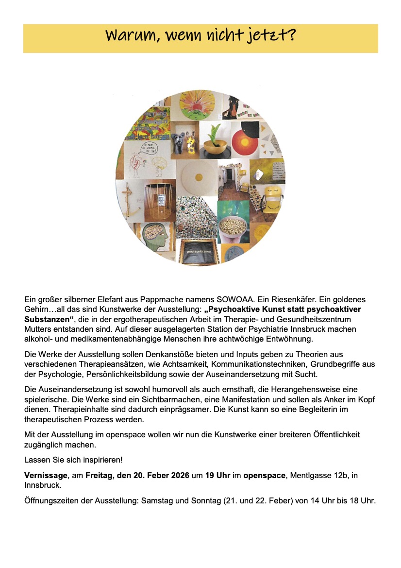 « Alle Veranstaltungen Ausstellung: „warum, wenn nicht jetzt? psychoaktive Kunst statt psychoaktive Substanzen“ 20. Februar 2026 | 19:00 – 22. Februar 2026 | 18:00 « COMMONING OPENSPACE Konzert: Stimme & Saz » Zum Kalender hinzufügen Google Kalender iCalendar Outlook 365 Outlook Live Details Beginn: 20. Februar 2026 | 19:00 Ende: 22. Februar 2026 | 18:00 Kategorie: communityart Veranstaltungsort openspace.innsbruck mentlgasse 12b innsbruck, tirol Austria Google-Karte anzeigen