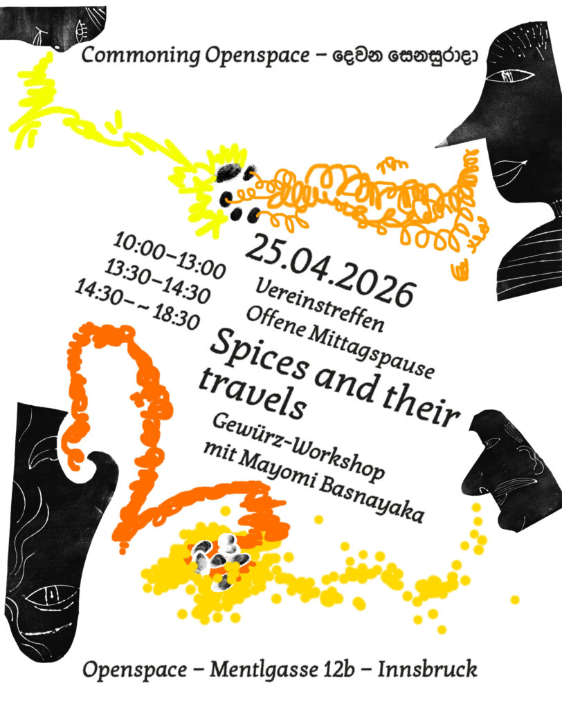 Um Anmeldung mit dem Betreff „Gewürze“ und Nennung etwaiger Unverträglichkeiten/Allergien an info@openspace-innsbruck.com wird gebeten. Hinweis: Der Workshop ist auf Englisch (Flüsterübersetzungen möglich!) und ist kostenlos. Alle Speisen sind glutenfrei und vegan.