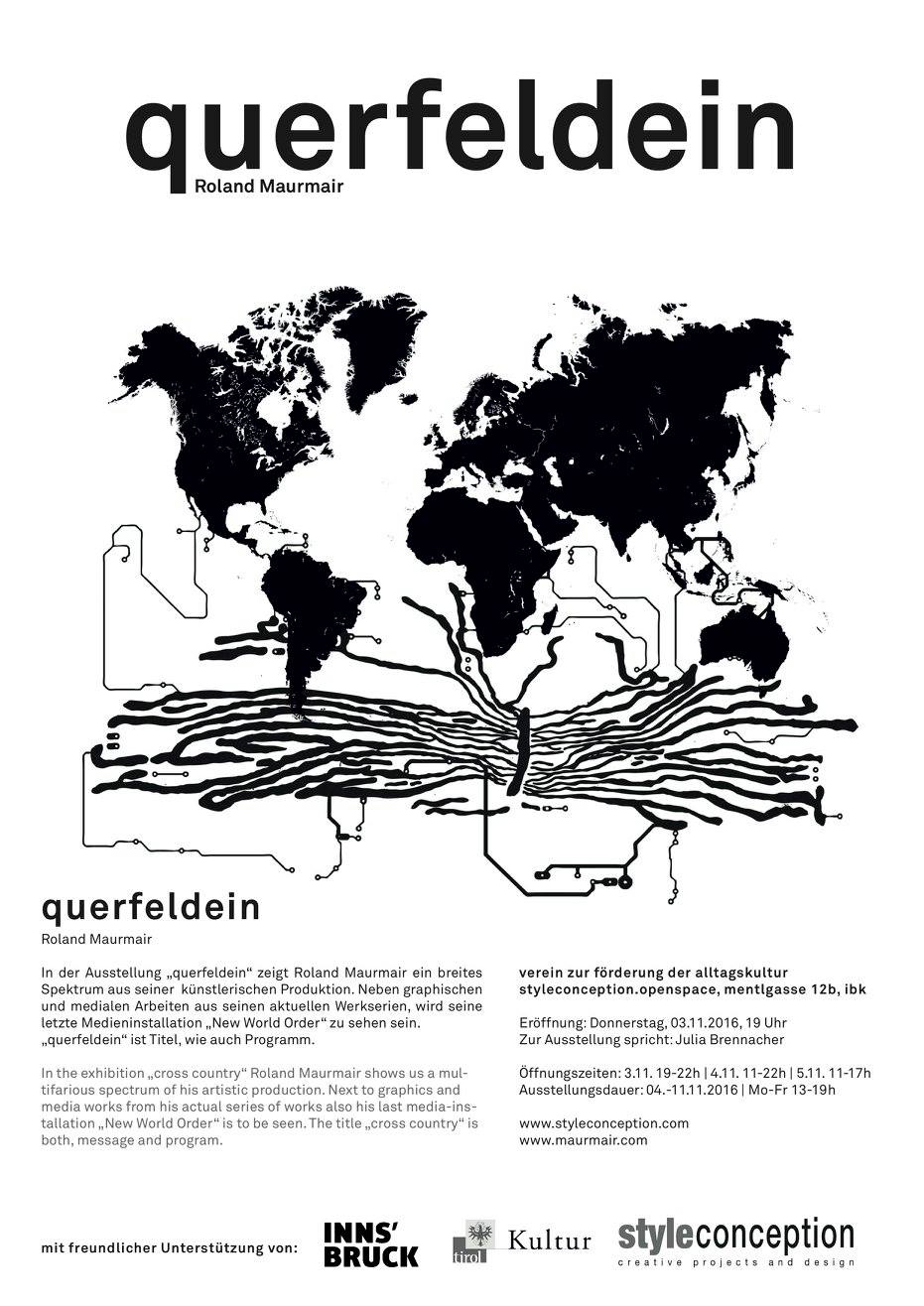 In der Ausstellung „Querfeldein“ zeigt Roland Maurmair ein breites Spektrum aus seiner künstlerischen Produktion. Neben graphischen und medialen Arbeiten aus seinen aktuellen Werkserien, wird seine letzte Medieninstallation „New World Order“ zu sehen sein. „Querfeldein“ ist Titel, wie auch Programm.
